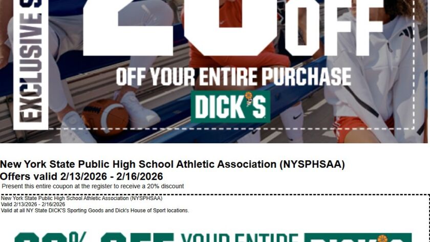 Dicks and NYSPHSAA offer 2/13-2/16 NewsFebruary 12, 202677Views0Likes0CommentsShop @DICKS X #NYSPHSAA Spring Shop Days from 2/13-2/16 and use the coupon for 20% off your entire in-store purchase!Read More